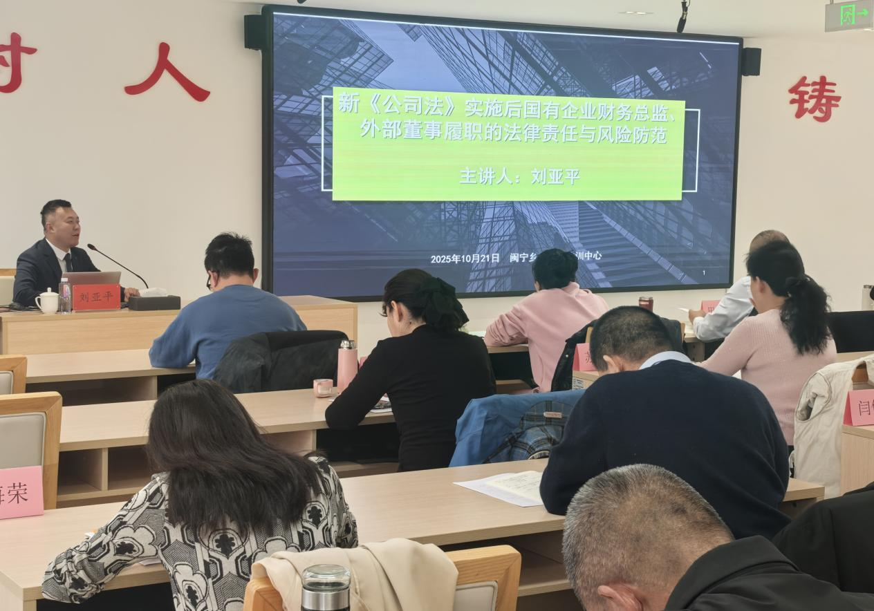 为进一步提升财务总监和外部董事履职能力和业务水平,强化企业合规管理,防范企业财务风险,助力国有企业高质量发展。 2025年10月20日至10月22日银川市国资委关于举办银川市国有企业财务总监及外部董事业务能力提升培训班在宁夏闽宁乡村振兴培训中心二楼会议室举行。本所刘亚平律师应邀为该培训班作《新<公司法>实施后国有企业财务总监、外部董事履职的法律责任与风险防范》专题辅导。